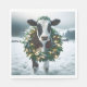 Una vaca en un pasto invernal usando una corona de Navidades verdes con luces brillantes