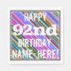Este divertido diseño de pañuelos de papel con temática de cumpleaños incluye un mensaje como "¡FELIZ 92º CUMPLEAÑOS, NOMBRE AQUÍ!", donde el nombre se puede personalizar. El fondo está decorado con unas rayas multicolores y vibrantes. El texto del mensaje es de color blanco y tiene una apariencia angustiada. Las servilletas como estas podrían ser usadas en una fiesta de cumpleaños para alguien que está celebrando su cumpleaños noventa. [~Z0000270]