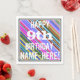 Este divertido diseño de servilletas de papel con temática de cumpleaños incluye un mensaje como "¡FELIZ CUMPLEAÑOS, NOMBRE AQUÍ!", donde el nombre se puede personalizar. El fondo está decorado con unas rayas multicolores y vibrantes. El texto del mensaje es de color blanco y tiene una apariencia angustiada. Las servilletas como estas podrían ser usadas en una fiesta de cumpleaños para alguien que está celebrando su noveno cumpleaños. [~Z0000270]