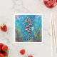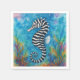 A seahorse, adorned with zebra-like stripes, floats gracefully against a vibrant underwater background painted in watercolor