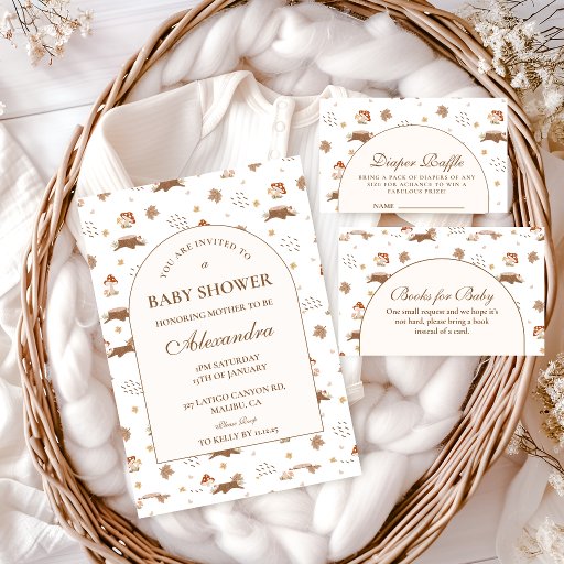 Celebrate a cozy woodland gathering with this autumn-inspired baby shower design, featuring charming forest animals, warm earthy tones, and delicate fall foliage. The soft storybook style and elegant arch layout create a timeless, inviting feel—perfect for a rustic, nature-inspired celebration. Ideal for fall events, this design blends whimsical details with a refined aesthetic for a baby shower that feels both intimate and beautifully styled.