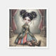 This whimsical dark circus doll illustration captures the mysterious charm of a vintage carnival. With her large expressive eyes, flowing red curls, and striped Victorian-style dress, the doll sits quietly atop a travel trunk surrounded by circus tents, bunting flags, and nostalgic stage props.
