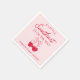 Celebrate a sweet new arrival with this sweetheart-themed baby shower napkin featuring a soft pink background and Valentine-inspired design. The phrase “A Little Sweetheart Is on the Way!” is displayed in a handwritten red script, with two red heart-shaped cherries tied with a bow shown below. The napkin can be personalized with the mother-to-be’s name displayed beneath the design. Festive and charming, this pink baby shower napkin is a lovely accent for Valentine or sweetheart-themed celebrations welcoming a baby girl.