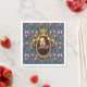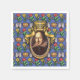 The Bard - El diseño original de estas servilletas de papel es un retrato del autor William Shakespeare. El retrato está en un marco dorado oval ornamentado con cintas y una corona encima. El fondo azul de la pared está decorado con castillos, coronas de reyes y flores amarillas y rojas, recordando el romance, la tragedia y la comedia de sus obras y poesía.