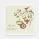 Estas servilletas tienen una rama con un pájaro y adornos, así como las palabras Feliz Navidad.