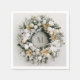 Las servilletas presentan su monograma inicial en medio de una hermosa corona de pino nieves adornada con adornos y flores de árbol de Navidad blancos y dorados.