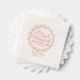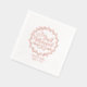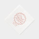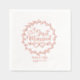 Una hermosa servilleta de Relieve metalizado de oro rosa con un florido florecimiento y nombres de novia y novio con fecha boda.