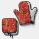 Vibrant, abstract shapes create a lively pattern filled with reds, pinks, yellows, and blacks, resembling a mosaic or stained glass effect. The overlapping forms give a sense of movement and complexity, inviting the eye to explore the intricate details.