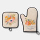 The oven mitt features a vibrant watercolor pumpkin surrounded by fall foliage, accented with your family name and “Fall Kitchen EST.” personalization for a warm, welcoming seasonal touch. The matching potholder showcases a lush autumn floral bouquet with mini pumpkins, rich berries, and golden leaves—perfectly complementing the mitt without feeling too matchy.
