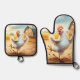 Feliz pollo bailando en la tierra con brillantes rayos de sol matutino y granero