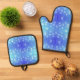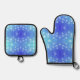 Two kitchen items: a square pot holder and an oven mitt with a blue and white polka dot pattern on one side. The reverse side is black.