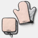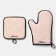 Abran el estilo retro con los puntos de polka de bonito y el melocotón pálido pastel que decoran este juego de guantes de horno y portaletas. El encantador conjunto se puede personalizar con un nombre en una tipografía de escritura elegante.