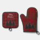 Rústico Búfalo Rojo y Negro Tocó Árboles de Navidad Oven Mitt & Pot Holder Set. Este fondo de manta de búfalo al estilo de este país tiene una silueta negra de un bosque de árboles. Un borde blanco alrededor de las siluetas hace que el diseño sea muy pop. Espacio fácil de editar para el texto.