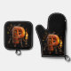 Una linterna de calabaza divertida de Halloween en forma de la letra "P" sosteniendo una lámpara con una llama.