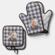 Personalised vintage rustic style gingham oven mitt and pot holder set with classic plaid blue pattern, custom name and photo for men and boys. Perfect kitchen gift for birthdays and special occasions!