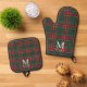 Personalized oven mitts and pot holders for the holiday season featuring classic style forest green and red Christmas plaid pattern with custom initial and name.