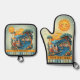 Oven mitt and pot holder set featuring a whimsical colorful illustration in Mediterranean style. A happy sun is cheerfully smiling at your delicious creations!