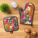 Manejar de forma segura bandejas de hornear, hojas de galletas y molduras de muffin del horno con este soporte para maceta y mitín de horno con guarnecido negro que muestra la foto de un jardín de Zinnias pequeñas y coloridas. ¡Un bonito diseño floral! Seleccione el estilo de respaldo de su soporte de olla.