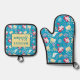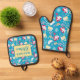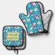Este lindo mitt de horno y portamaletas presenta un adorable patrón con pájaros blancos coloridos, corazones rojos y tazas amarillas dulces contra un fondo azul brillante. Personaliza con tu nombre. Hace el regalo perfecto para tu esposa, mamá o abuela por el Día de la Madre, cumpleaños o ocasión especial.