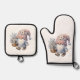Cute adorable Gnome carrying daisies on a set of oven mitt and pot holder. Makes a great gift for the gnome lover in your life.