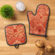 Diseño textil indio en tonos naranjas - una imagen antigua se imprime en este conjunto de Oven Mitt & Pot Holder. Muestra flores estilizadas y forma de corazón. El ilustracion, originalmente de un libro antiguo, fue editado y aplicado a varios artículos de Alma Wad. Es un regalo ideal para la abuela. Cortesía de los Archivos de Internet Imágenes de Libros: "Textiles Decorativos", Hunter, 1918.