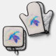 Un diseño colorido de un colibrí y un girasol sobre un soporte de maceta y una cacerola de horno.