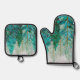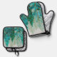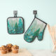 Bring woodland charm to your holiday kitchen with this matching oven mitt and pot holder set, featuring stylized evergreen trees in rich shades of green and teal. Delicate gold accents outline each tree, adding a touch of shimmer against the snowy white background. Perfect for baking festive treats or gifting to your favorite holiday host, this set blends functionality with seasonal elegance—turning everyday kitchen moments into cozy winter memories.