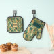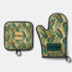 Hojas verdes exóticas de patrón disperso mostradas sobre un fondo dorado. Personalización de texto en el mitt de horno y en el soporte de la olla.