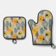 Un diseño floral que recuerda a los años 50 y 60, con flores azules-grises y naranjas-amarillas, hojas verdes y negras sobre un fondo gris.