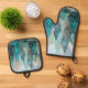 Add a touch of woodland wonder to your holiday kitchen with this matching oven mitt and pot holder set, featuring abstract pine trees in soothing shades of teal, turquoise, and blue. Gold and white detailing glimmers like frost on evergreens, while the snowy white background evokes peaceful winter mornings. Whether you're baking festive treats or gifting a cozy kitchen accent, this set blends functionality with seasonal charm—perfect for nature lovers and holiday hosts alike.