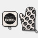 Sauce Boss es el mitt perfectamente poético y el set de postre para los platillos, con el sobriquet representado con negrita blanca, letras en bloque sobre un círculo negro. Diseño y copia © W.H. Sim. Todos Los Derechos Reservados. Ver más en zazzle.com/wordsofwhimsy