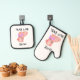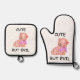 Oven Mitt & Pot Holder Set con una caprichosa imagen de gato que se puede ver como adorable y un poco "malvado". Aunque el ilustracion es principalmente dulce y caprichoso, fácilmente podría ser enmarcado como "engañosamente inocente" — el tipo de arte que juega con la idea de que los gatos son partes iguales adorables y diabólicos.