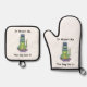 Oven Mitt & Pot Holder Set con un ilustracion que muestra un gato de aspecto gruñón sentado con una taza de plástico pegado en la cabeza como un casco. Es una postura humorística, un poco sarcástica sobre los gatos, torpeza, y esos momentos "por supuesto que esto me pasaría a mí".
