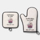 Oven Mitt & Pot Holder Set con un ilustracion lúdico de un diseño de gato con temática de cumpleaños que es lindo, caprichoso y humorístico.