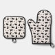 Este adorable mitt de horno y portamaletas para los amantes del gato presenta un patrón de gatos negros en diferentes poses con huellas de pata sobre un fondo blanco.