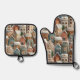 A hand drawn and painted town of gingerbread houses in muted red, orange, green and blue with touches of white icing. A charming Christmas season oven mitt set that matches the apron and kitchen towel in the same design.