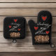 Nos gusta cocinar para nuestras familias. Le ponemos mucho amor a nuestro horneado. Es por eso que nuestra comida sabe tan bien. Esta manta de horno y el portaobjetos expresan eso. Este diseño es una imagen impresa con pintura acrílica para los corazones rojos, alfileres y galletas.