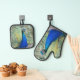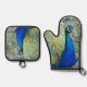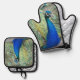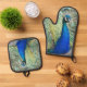 ¡Para los fanáticos del pavo real! Manejar de forma segura bandejas de hornear, hojas de galletas y latas de muffin del horno con este soporte de maceta con guarnecido negro que presenta una imagen fotográfica de un hermoso Peacock azul con plumas de plumas coloridas. Seleccione del estilo del soporte cuadrado de la olla o el estilo del mitt del horno, o pida un conjunto de ambos. Imagen impresa en un solo lado.