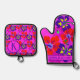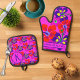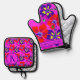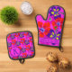 Flores hibiscus sobre rosa caliente, juego de cocina del horno mitt y portamaletas. Colores rojos, violetas y amarillos con un gran diseño en el mitt con un patrón más pequeño de flores en el portaobjetos de la olla. Añada su nombre al mitt y un nombre inicial al portaobjetos. Un diseño audaz para que cualquier cocinero o panadero lo aprecie.
