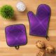Juego de agarraollas morado y manopla con ribete negro. El patrón geométrico en la parte delantera añade un toque moderno, mientras que la parte trasera es de color negro liso.