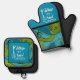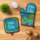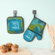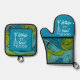 Azul claro en tonos turquesa, pares con un verde tilo o salvia y negro sobre un trazo abstracto de rotación para que la cocina de moda tenga un toque moderno; y un mensaje divertido para el chef de: "Que se vaya bien".