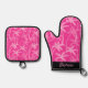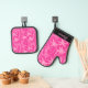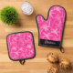 Este conjunto de mitt de horno presenta un diseño tropical con palmeras en un fondo rosado caliente. Personalizarlo con un nombre.
