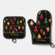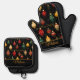 Un Navidad colorido y brillante Oven Glove y Pot Holder con el diseño de brillantes adornos de baudibles de árbol en colores brillantes de rojo dorado y azul todo sobre un fondo negro. El saludo "Feliz Navidad" en una fuente de color dorado se puede personalizar con cualquier saludo que sea necesario, y luego personalizar con un nombre.