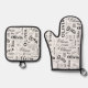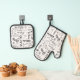 This custom pot holder and oven mitt set showcases "Olivia" with a "O" monogram. Its unique background pattern, formed from the letter "J)" is in black, white, and grey and can be tailored for any name or initial.