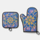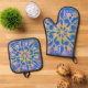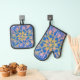 Tablero de hormigón y soporte de olla con diseño de mandala amarilla y azul.