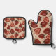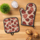 El patrón incluye fresas rojas vibrantes con detalles intrincados, rodeadas de delicadas flores blancas sobre un suave fondo beige. Este diseño evoca una sensación de calidez y nostalgia, simbolizando la alegría y el amor que provienen de la cocina casera y de los momentos compartidos en la cocina. Es un recordatorio sencillo pero sincero de la comodidad que se encuentra en la preparación de las comidas con cuidado y afecto.