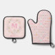 This oven mitt set design has a preppy grandmillennial holiday treats pattern with cookies, candies and gingerbread with pink bows. The pot holder has a coordinating monogram design where you can personalize with an initial and a name.