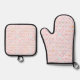 This oven mitt set design has a preppy grandmillennial holiday treats pattern with cookies, candies and gingerbread with pink bows.