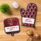 El diseño personalizado del patrón de Apple hará saber a todo el mundo quién es la cocina. La inscripción en el personalizable de color burdeos se muestra contra una franja blanca con un patrón de manzana y manzana de fondo. Gran idea de regalo.