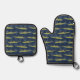 ¿Los lagartos en la cocina? Hágale saber al mundo que las cosas se vuelven salvajes cuando estás cocinando con este divertido juego de mariposa y mitt de horno. El ilustracion de estilo realista de los lagartos en verde se enmarca en un fondo de color azul marino.